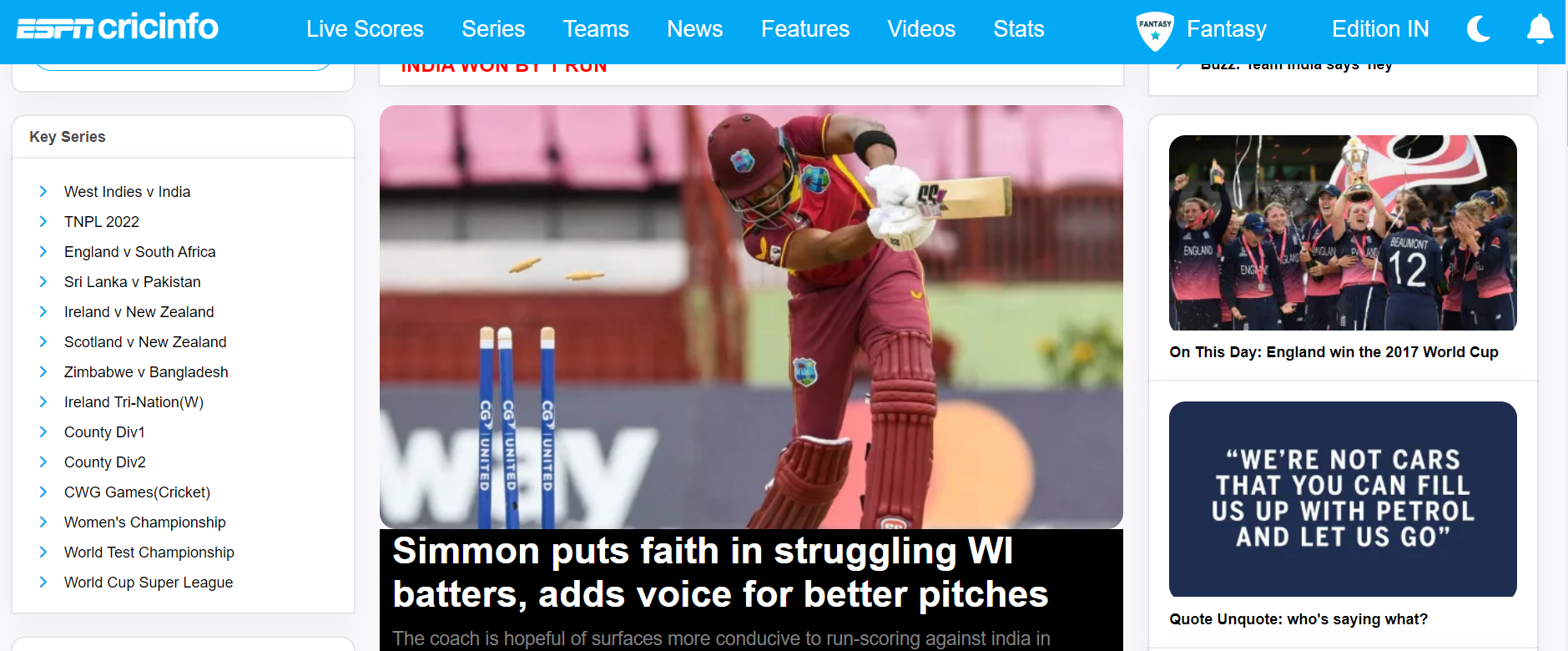 CricInfo is online website that helps you to find Live Cricket Scores, Match updates, Results, News, Articles at ESPNcricinfo. My team and I made a perfect replica of their website.